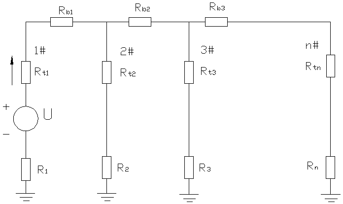 Rb1、Rb2、Rb3、…—各檔避雷線的電阻(包括接觸電阻);Rt1、Rt2、Rt3、…—各基桿塔的電阻(包括接觸電阻);