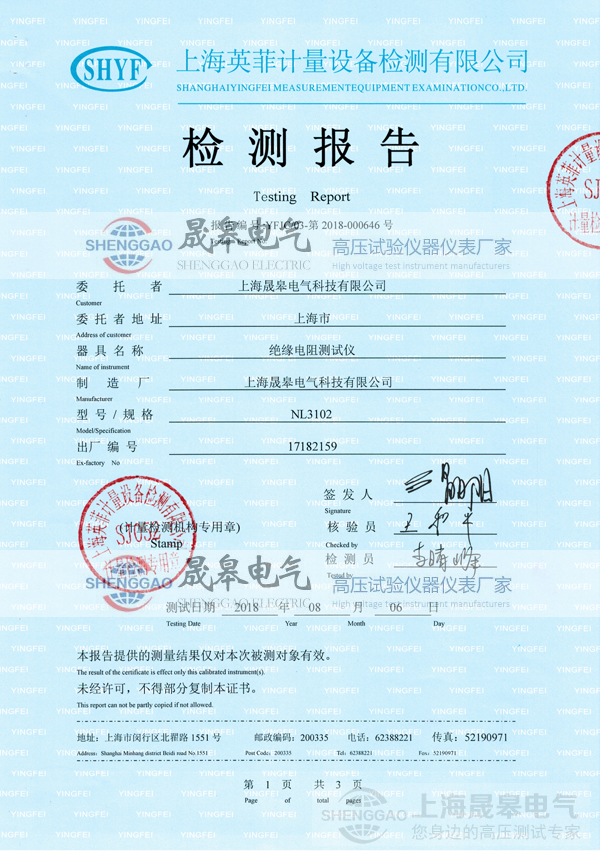 > 晟皋NL3102絕緣電阻測試儀檢測報告